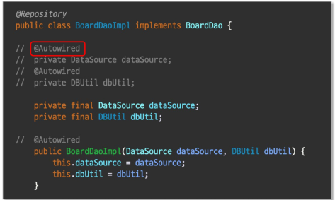@Autowired // 생성자 주입 : 생성자가 하나밖에 없는 경우 @Autowired를 생략해도 자동 주입